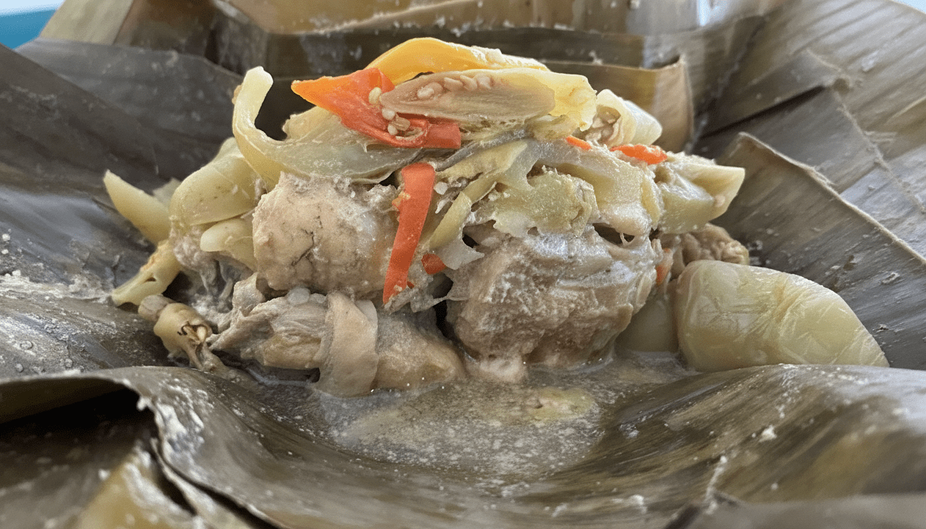 Ayamnya harus kampung karena menghasilkan kaldu yang harum dan dagingnya tidak hancur dalam proses pengukusan yang lama.