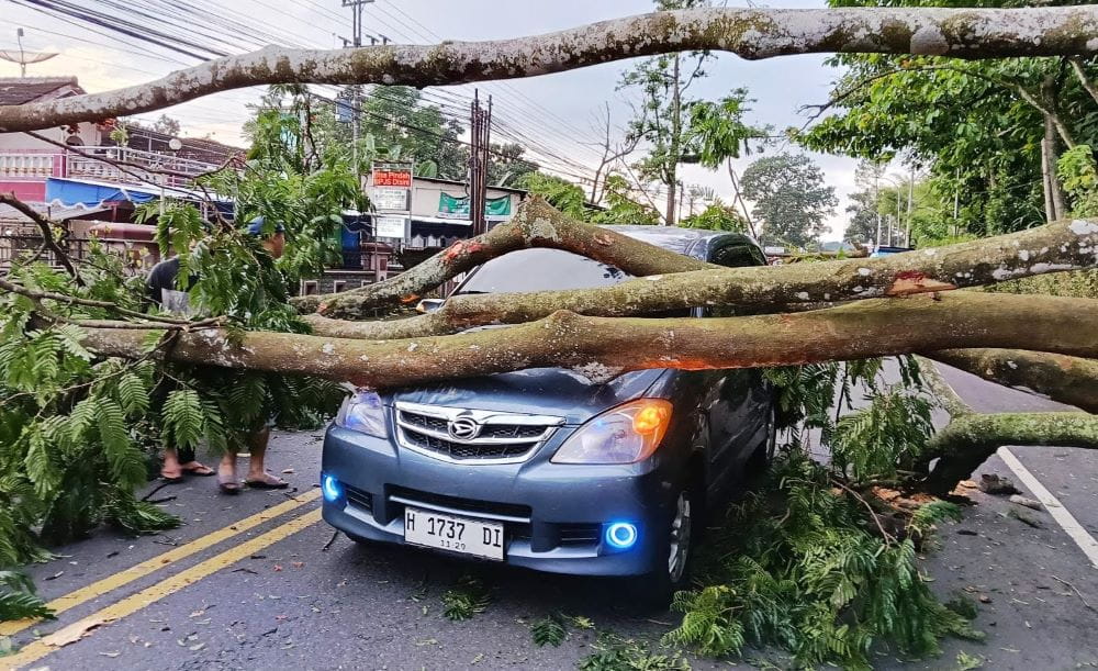 Pohon Pete Setinggi 15 Meter Tumbang Timpa Daihatsu Xenia, Jalan Raya Solo – Semarang Sempat Terganggu